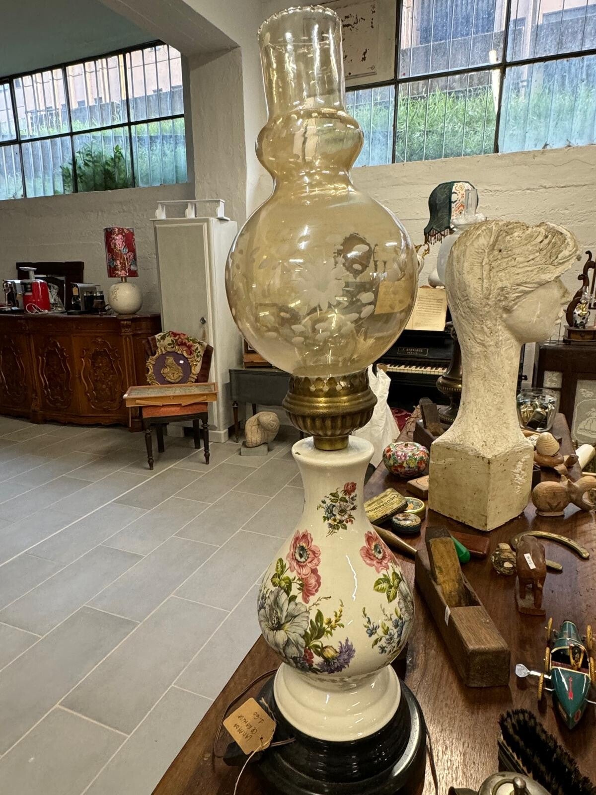 Antica lampada a olio, in ceramica dipinta a mano, rivisitata con attacco elettrico.