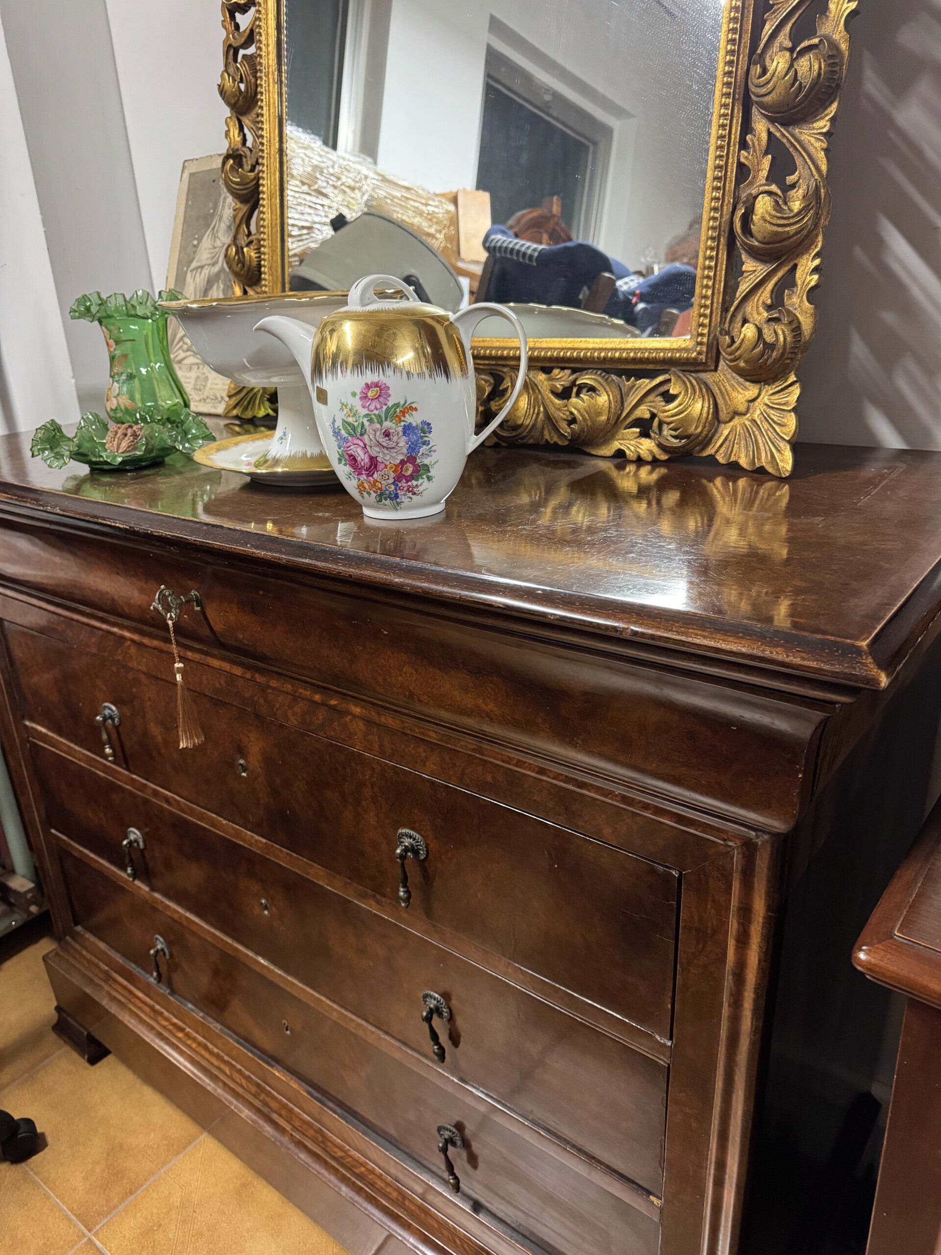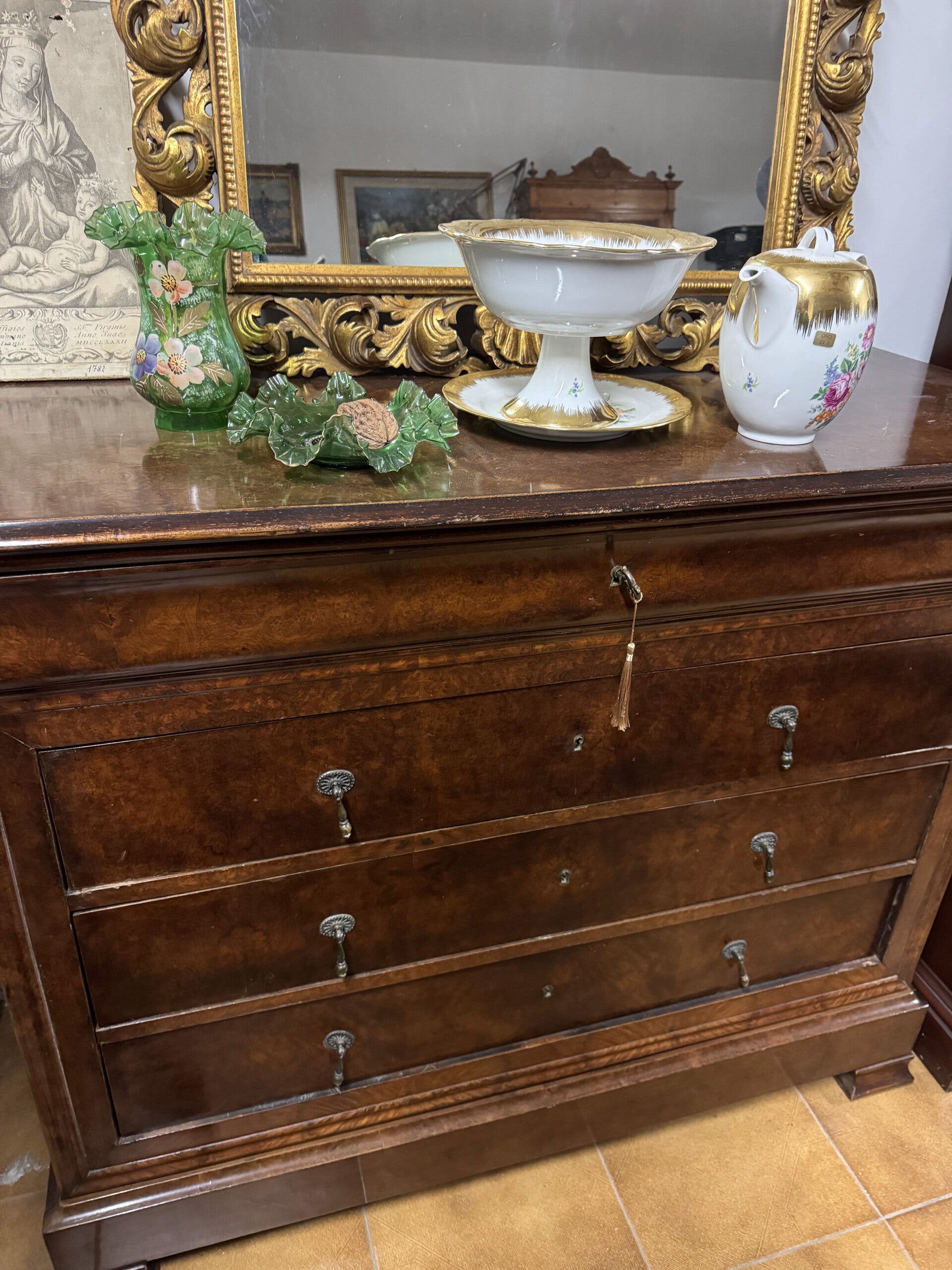 Cassettiera Luigi XVI in piuma di mogano con cassetto segreto.